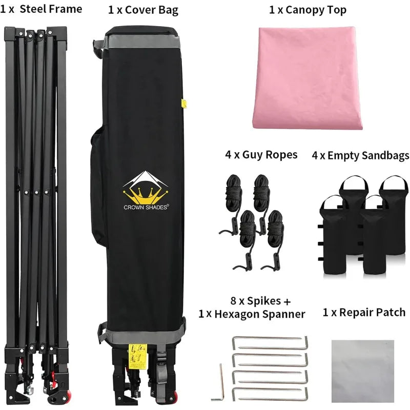 - HIGH GRADE STEEL FRAME - The durable, high-grade, corrosion-resistant steel truss frame with hardened through bolts comes pre-assembled and can be set up without any tools. Engineered to support up to 120 lbs. distributed across the frame, it ensures robust and reliable performance. The extended ceiling assembly and upgraded high peak design make it easier for rainwater to run off, preventing water pooling on the canopy. Perfect for extended outdoor use at markets, festivals, and exhibitions.