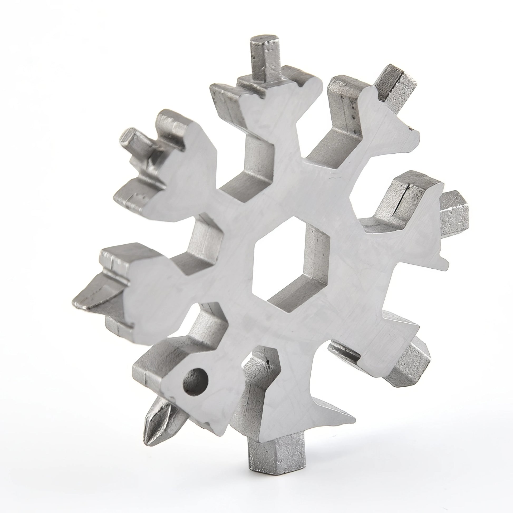 Snowflake multifunctional tools: slotted screwdriver and box cutter, rope cutter, keyhole, cross screwdriver. Easy to carry, can be used as a gift or hanging pendant. It can be hung on keys or backpacks, and the keychain design prevents loss. The unique snowflake shaped design allows us to creatively combine the perfect shape of nature with functionality and design in a compact multifunctional tool. Multiple uses: can be used to open beer bottles, rotate screws, secure skis, bicycles, toys. It can also be used for outdoor activities such as camping, boarding, and rescue.