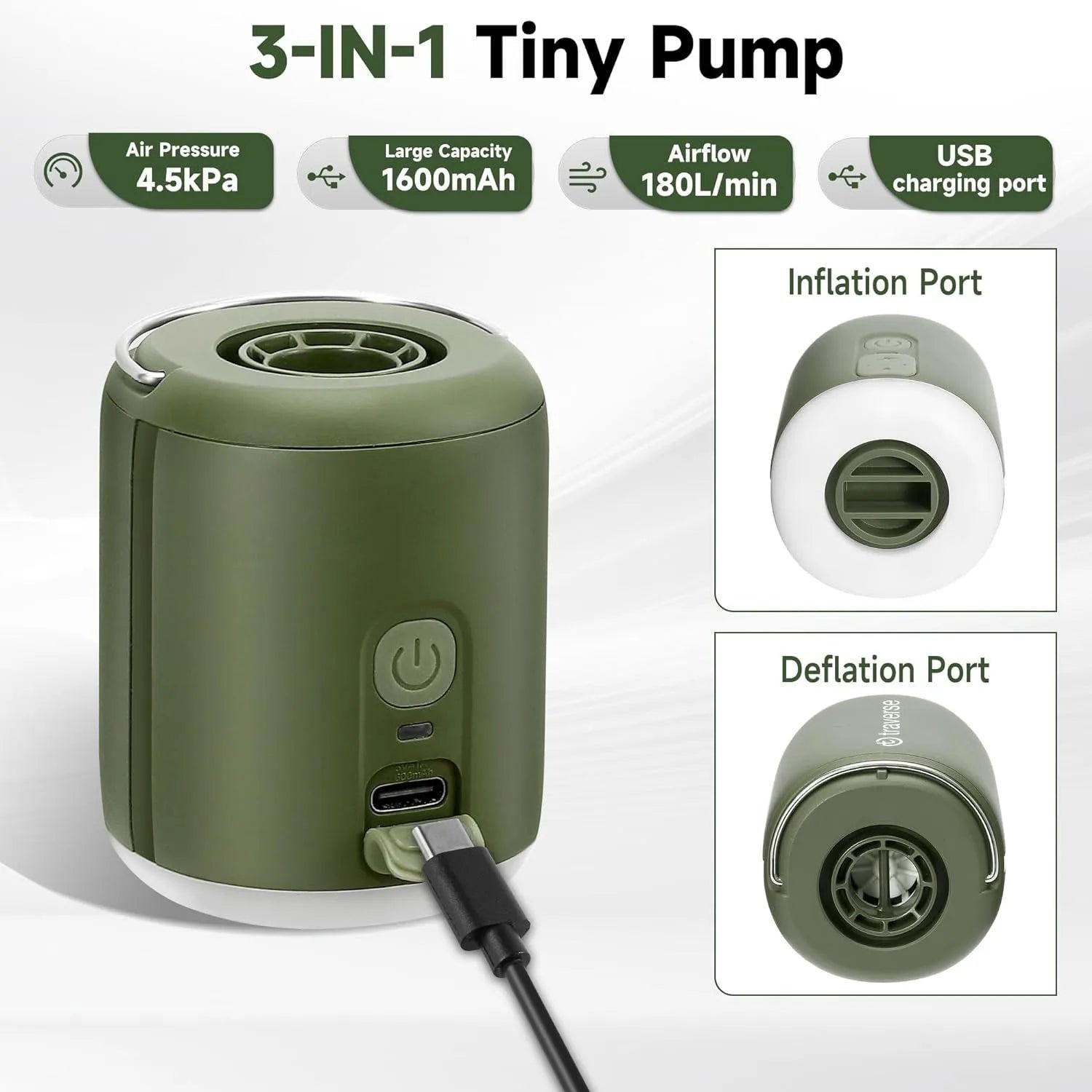 Experience ultimate convenience with our Compact Yet Powerful Mini Inflatable Pump, perfect for your outdoor adventures. Weighing only 3.6oz, this small but mighty pump boasts an impressive air pressure of 4.5kPa (0.65 PSI). Whether you're inflating camping air mattresses or deflating storage bags, this versatile tool is a must-have for every traveler. It even provides up to 8 hours of light in a single charge, making it an essential addition to your camping gear. (Note: Not suitable for balloons, basketballs, or tires!)